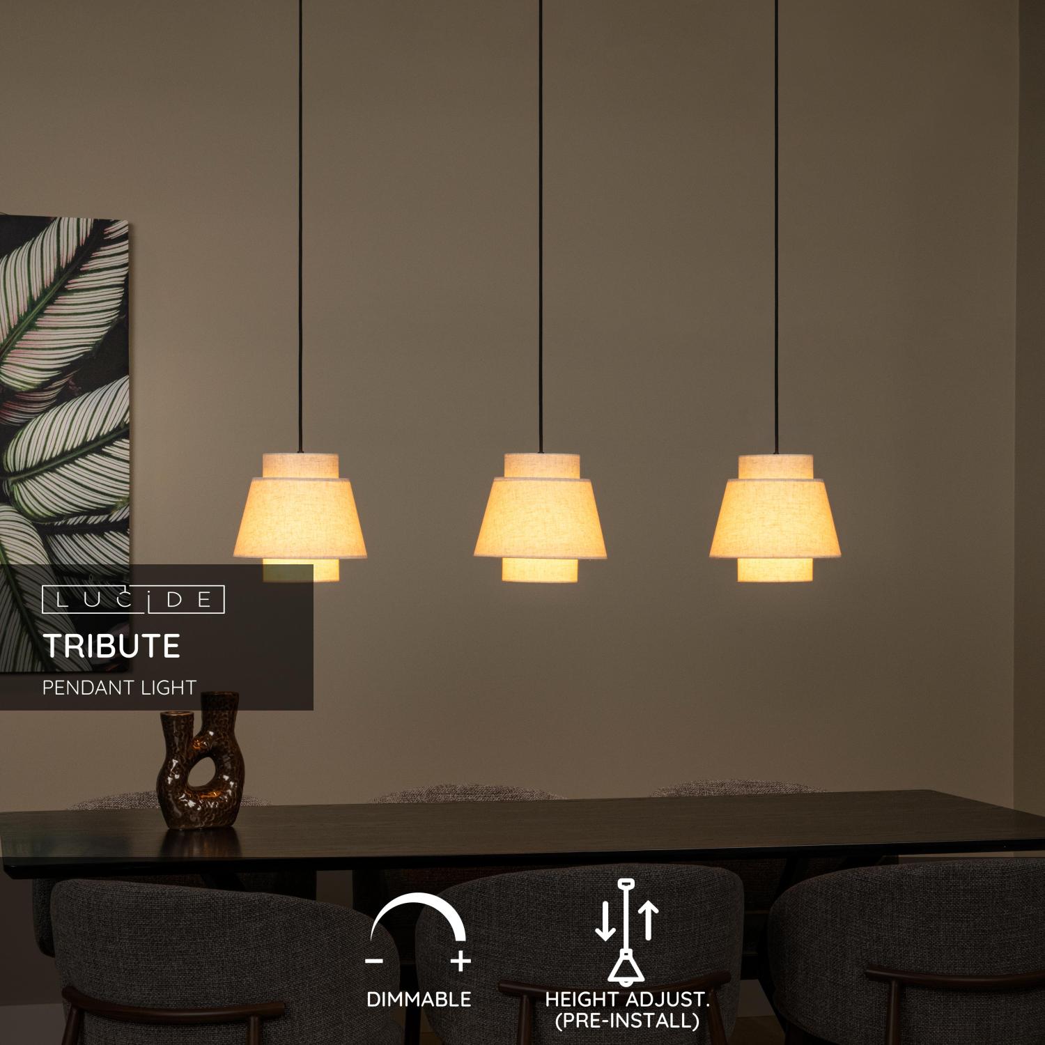 Ste fanúšikom prírodných materiálov a prirodzených farebných tónov v dizajne vášho interiéru? Potom je toto závesné svietidlo práve pre vás. Tribute oslavuje svetlo svojimi tromi tienidlami vyrobenými z vysokokvalitného textilu. Každý odtieň má valcovú vnútornú časť a vonkajšiu časť v tvare A, ktorá rozptyľuje príjemnú a jemnú žiaru. Pocta je ideálna nad dlhý jedálenský stôl alebo pri bare. Výšku závesného svietidla je možné pred inštaláciou nastaviť maximálne na 150 centimetrov. Toto závesné svietidlo môžete tiež jednoducho pripojiť k externému stmievaču.