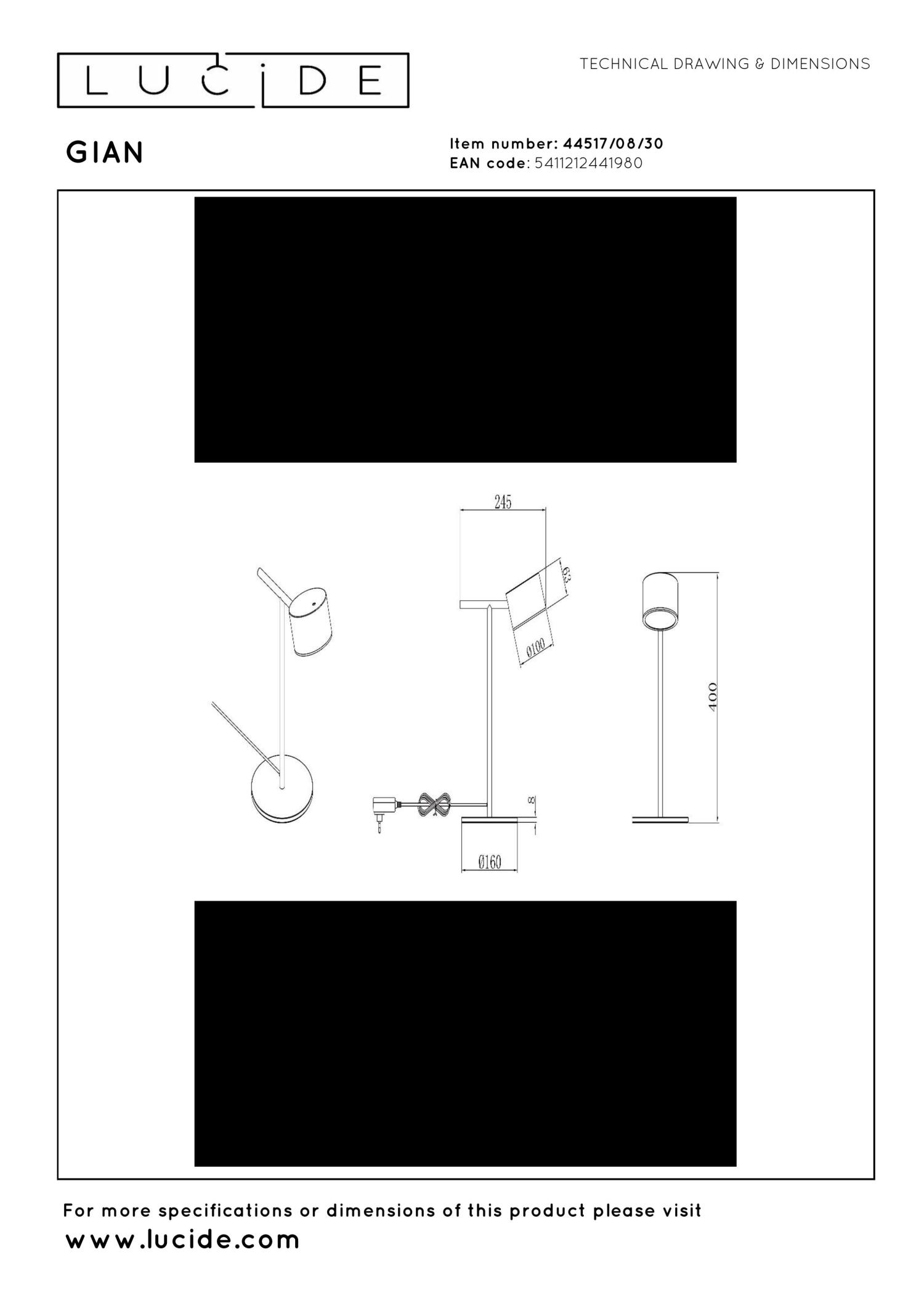 Spojte súčasný dizajn s praktickou funkčnosťou so stolnou lampou Lucide GIAN. Toto moderné svietidlo je vyrobené z kvalitného čierneho kovu s matným povrchom a je štýlovým doplnkom každého interiéru. Integrovaný stmievateľný LED svetelný zdroj poskytuje teplé biele svetlo (2700 K) a ľahko sa ovláda pomocou dotykového stmievača na svietidle. S výškou 40 cm, šírkou 24,5 cm a hĺbkou 16 cm je táto stolná lampa kompaktná a všestranná. Ideálne pre použitie na stole, nočnom stolíku alebo príručnom stolíku. Dajte svojmu priestoru elegantný a funkčný upgrade so stolnou lampou GIAN!
